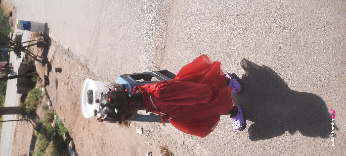 A child, viewed from behind, stands on a paved surface in Homa Bay, Kenya, under direct sunlight. The child wears a long-sleeved red dress with a tiered skirt, purple clogs, and a white beaded necklace. Their dark hair is styled in multiple small braids or twists, adorned with white and red beads. A pronounced shadow of the child is cast on the ground to their left. To the child's right and slightly behind, a blue plastic stool supports a translucent white plastic bucket with a dark, irregularly shaped object inside. The paved surface extends into the background, bordering a dirt area with sparse vegetation and visible debris. In the mid-ground, a dark vertical pole is visible. Further in the background, another paved or dirt road is visible, with multiple indistinct human figures and a makeshift wooden structure.