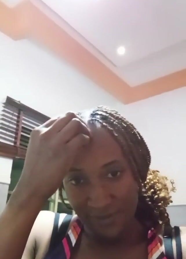 A woman with braided hair wearing a tank top is indoors. She touches her forehead and then her face. The background includes a window with blinds, a white ceiling with a chandelier, and orange trim.