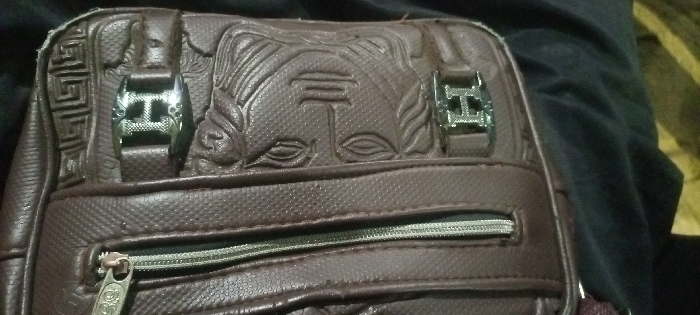 A close-up shot reveals a brown leather bag. The bag has a textured pattern with a raised design resembling a face or figure. Two silver buckles with an "H" design adorn the bag, flanking the raised design. A zipper with a decorative pull is visible at the bottom. The bag appears to be of small to medium size, with a sturdy construction. The background is blurred and dark, suggesting the bag is placed on a dark surface.