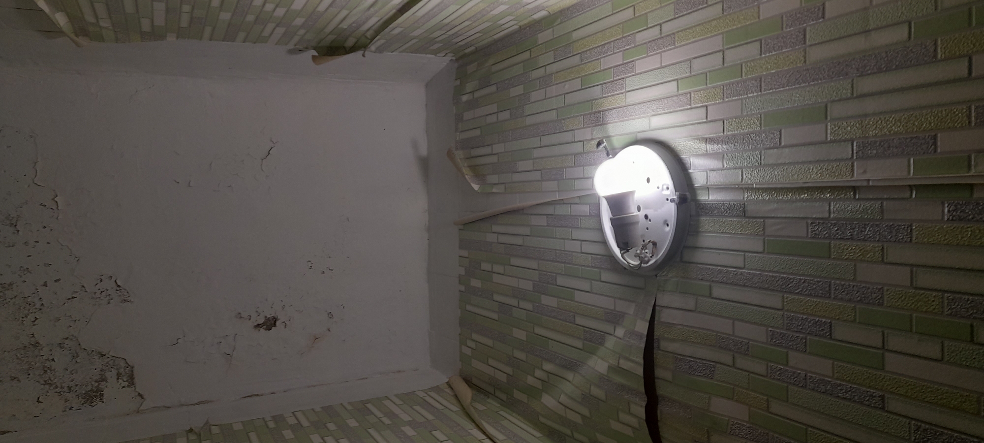 This image depicts an interior corner of a room in Sofia, Bulgaria, characterized by significant disrepair and an improvised lighting setup. The overhead white concrete ceiling shows extensive peeling paint, cracks, and visible water damage or mold/mildew. The upper wall sections are painted a faded off-white with similar peeling and cracking. The lower two-thirds of the walls, and what appears to be the floor, are covered in vertically oriented rectangular tiles arranged in a mosaic pattern of varying shades of light green, dark green, light gray, and dark gray/black, some exhibiting a textured surface. Portions of what appears to be wallpaper or a similar covering are peeling away from the walls, particularly along the top edge of the tiled section and in the corners. A bare, illuminated incandescent light bulb is screwed into an exposed, circular, silver-colored light fixture, which rests directly on the tiled surface. Wires are visible extending from the light fixture, suggesting it is not properly mounted. No individuals or active subjects are present. The scene conveys a sense of neglect or an incomplete renovation.