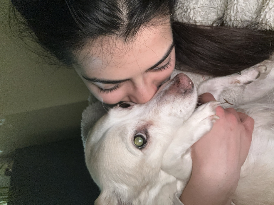 - "An indoor, close-up image depicts a female embracing a white dog" by FM-euRPG3, licensed under CC BY 4.0