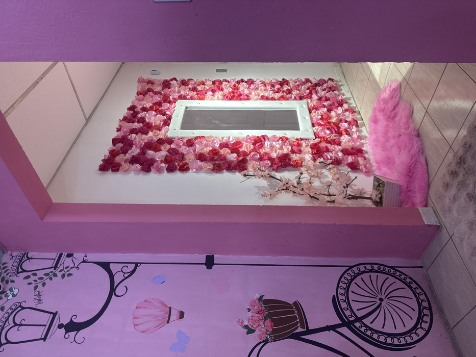 A whimsical, pink-themed room with a focus on floral aesthetics. The wall features a mural with drawings of a lamppost, a hot air balloon, and a bicycle with a basket of flowers. Above, the ceiling is adorned with a square of pink and red fabric flowers, framing a rectangular window. A fluffy pink object is located in the upper right corner, positioned near what appears to be a light grey rug on the tile flooring. The overall impression is of a fanciful and romantic space.