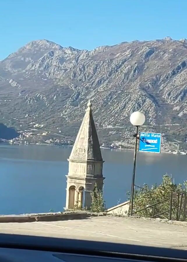 From inside a car, the video shows a picturesque coastal scene with mountains in the background, bodies of water, and an old stone tower in the foreground. The video starts with a view partially obstructed by parked cars, then focuses on the tower as the car moves forward. A sign is visible that reads "Bella Vista," indicating a viewpoint. The vegetation includes trees and cacti. The sky is clear and blue.