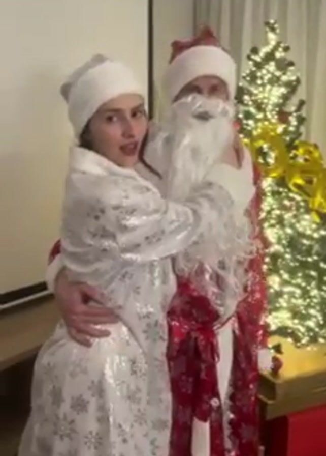 In a cheerfully lit room, a man dressed as Santa Claus playfully lifts and holds a woman in a snowflake-patterned costume. The woman laughs and looks up at the camera as Santa holds her securely. Behind them, a decorated Christmas tree shines, with golden “2024” balloons subtly placed near the top. A white projector screen is partially visible on the left side of the frame, and Christmas gifts are stacked neatly at the base of the tree.