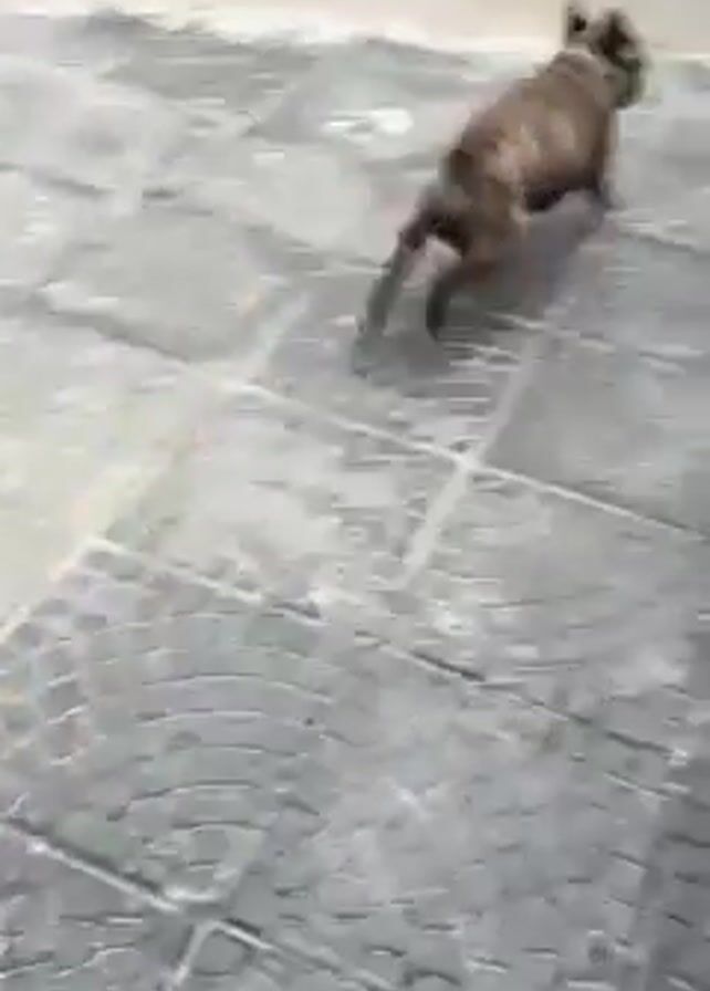 A brindle puppy runs across a grey concrete patio. The patio has a geometric circle pattern. The puppy approaches a partially open gate and goes through it. A blue hose is hanging on the side of the wall next to the gate. A black metal chair with a brown wooden seat is on the patio. The camera follows the puppy.