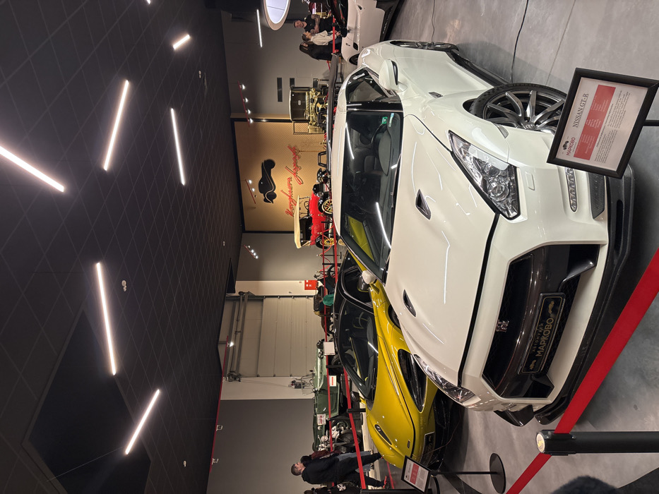 The image depicts the interior of an automobile museum located in Markovo, Bulgaria, identified by prominent signage. The environment features a dark grey tiled ceiling with multiple diagonal linear LED light fixtures. Walls are a light grey, with a textured brown-gold accent wall in the background displaying a black silhouette of a classic car and the stylized text "Автомобилен Музей МАРКОВО." The floor is a polished light grey concrete. Red velvet ropes on black stanchions delineate exhibit areas. In the foreground, a white Nissan GT-R sports car is displayed, positioned at an angle facing slightly left, with a black front grille, hood vents, and dark grey multi-spoke wheels. A black plate with "Автомобилен Музей МАРКОВО" is affixed to the front bumper. A red sign stand directly in front identifies the vehicle as "NISSAN GT-R." Immediately behind it and to the left, a bright yellow McLaren supercar is parked. In the midground to the left, several individuals are present; one man in a dark jacket is seen walking. Further back, a dark green vintage open-top car and a classic motorcycle are visible. To the right midground, a red vintage car with a tan soft-top is on display. In the background on the right, a small group of approximately three to four individuals, including a woman in a black jacket and a man in a dark shirt, are standing and observing the exhibits. A large white roll-up garage door is visible on the left side of the back wall.