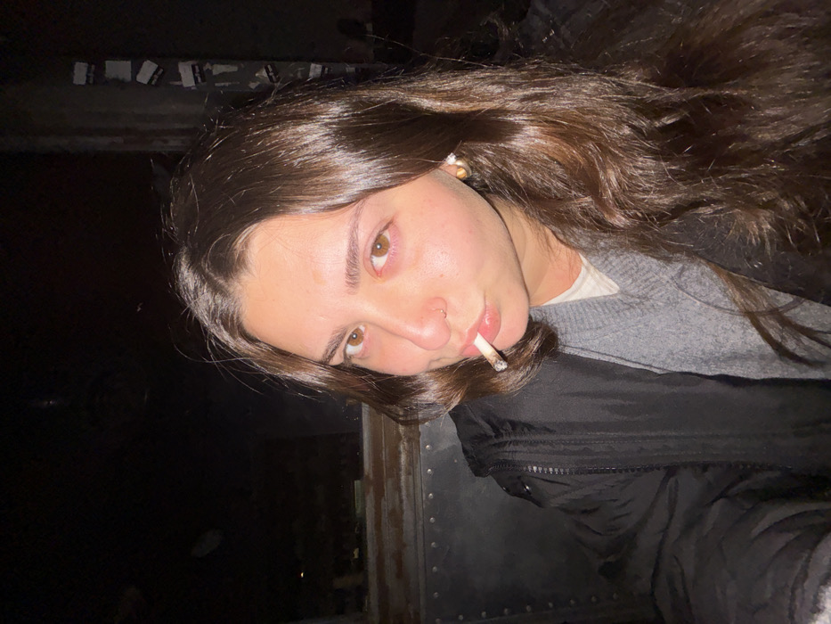 A brunette woman with light brown eyes holds a lit cigarette in her mouth, her head tilted to the left