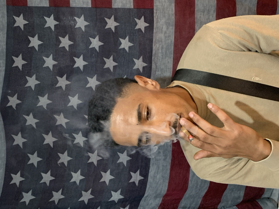 An individual, identified as a male, is depicted in a medium close-up, indoors in Tangier, Morocco. He has a medium skin tone, dark short hair styled with a fade, and a dark mustache. He is wearing a light brown or beige long-sleeved turtleneck garment and a black strap, possibly from a bag, diagonally across his chest. The individual holds a lit, hand-rolled cigarette or blunt between the thumb and index finger of his right hand, positioned near his mouth. Plumes of white smoke emanate from the object and obscure part of his face. His gaze is directed downwards and to his left. Behind him, serving as a backdrop, is a wrinkled American flag, displaying white stars on a blue field and red and white stripes.