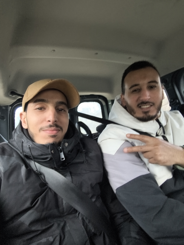 The image depicts two adult males seated inside a vehicle. While the contextual information indicates the city of Sabaa Aiyoun, Morocco, the specific location within the city is not visually discernible from the image itself, which shows an indoor vehicle environment. The male positioned on the left is wearing a tan corduroy baseball cap and a dark, possibly black, puffer jacket. A black seatbelt is visible diagonally across his chest. He has a light complexion, dark hair, a short mustache, and a short beard, and is looking directly at the camera with a neutral expression. The male positioned on the right is wearing a multi-colored hooded jacket, segmented into white on the top, light grey in the middle, and dark grey on the lower portion of the arm and torso. He also has a light complexion, dark hair, a mustache, and a short beard. He is looking directly at the camera and has his right hand raised, forming a V-sign (peace sign) with his index and middle fingers extended. The vehicle interior features a light grey ceiling and dark-colored window frames. The external view through the vehicle windows is indistinct.