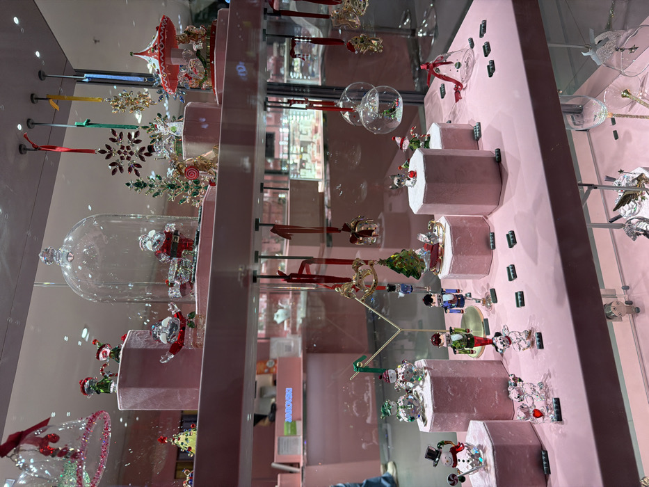 A retail display case holds crystal Christmas ornaments on pink pedestals and suspended from metal bars