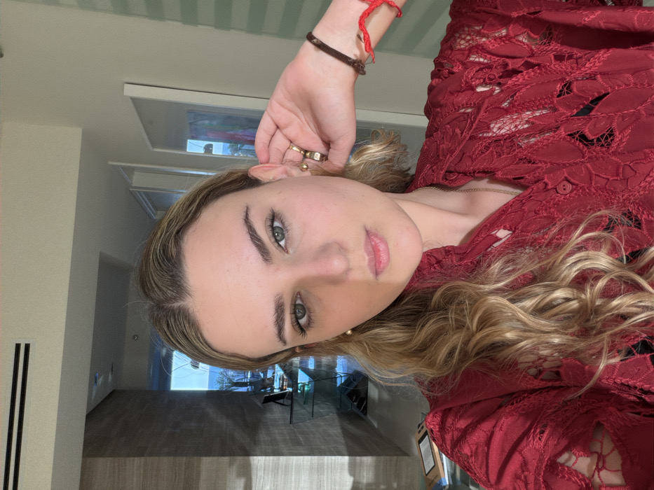 An adult female is depicted in a selfie-style portrait, situated indoors within a modern residence in Key Biscayne, United States of America. She possesses a fair complexion, wavy blonde hair parted centrally, and green eyes, maintaining a neutral expression directed at the camera. She wears a red collared shirt with an intricate lace cut-out pattern resembling leaves, layered over a dark undergarment. Her accessories include small gold stud earrings in both ears, a gold-toned ear cuff on her right ear (viewer's left), a thin gold chain necklace, and on her right wrist (viewer's left), a brown cord bracelet alongside a red string bracelet. Her right hand (viewer's left) is raised, with fingers touching the area behind her right ear, seemingly interacting with the ear cuff. The background reveals a contemporary interior space. To the subject's left (viewer's right), a hallway or passage features light-colored, possibly textured, wall panels. Further back and centrally located, a multi-tiered clear glass console table with geometric supports is visible, displaying an indistinct dark object on a lower shelf. Beyond this, a large window or glass door presents an exterior view of a bright blue sky, the ocean, and distant tropical vegetation, including palm trees, indicating a coastal setting. A balcony railing or architectural element is faintly discernible. To the subject's right (viewer's left), a plain light-colored wall features a white-framed picture or mirror. Horizontal blinds are partially visible further to the right. A linear diffuser air vent is integrated into the white ceiling. Lighting is characterized by a strong source from the right (viewer's left), casting a distinct shadow across the left side of the subject's face and the adjacent background wall.