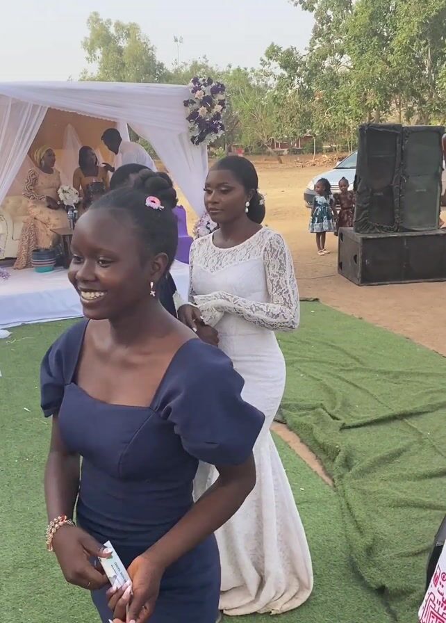 A man and a woman are dancing at an outdoor wedding reception. The man is wearing a dark suit and a yellow tie. The woman is wearing a white lace wedding dress. They are holding hands and looking at each other. The reception is taking place on a lawn, and there is a white tent set up in the background. A number of people are gathered around the tent. A young woman in a blue dress smiles into the camera as the happy couple begin to dance. Several speakers and a vehicle are to the right of the happy couple.
