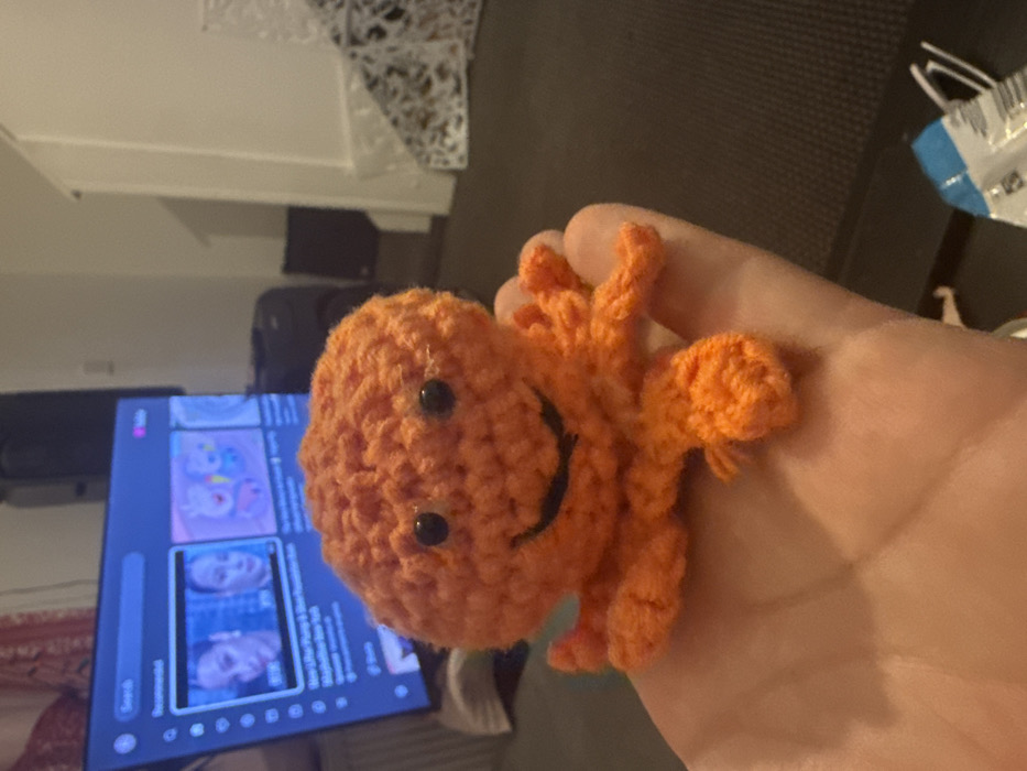 n indoor residential scene in Boston, United Kingdom. In the foreground, a human hand, palm open, cradles a small, orange, crocheted octopus toy. The toy has two black, round bead eyes and a stitched black smile. In the background, a large, dark-framed flat-screen television displays what appears to be a video streaming interface with a "Search" bar and "Recommended" section, showing multiple thumbnail images, some depicting women's faces and others animated characters. To the right of the television, parts of a light-colored wall and dark flooring are visible, along with the corner of a white furniture item featuring a decorative cut-out pattern. The room is generally dimly lit, with the television screen providing a primary light source.