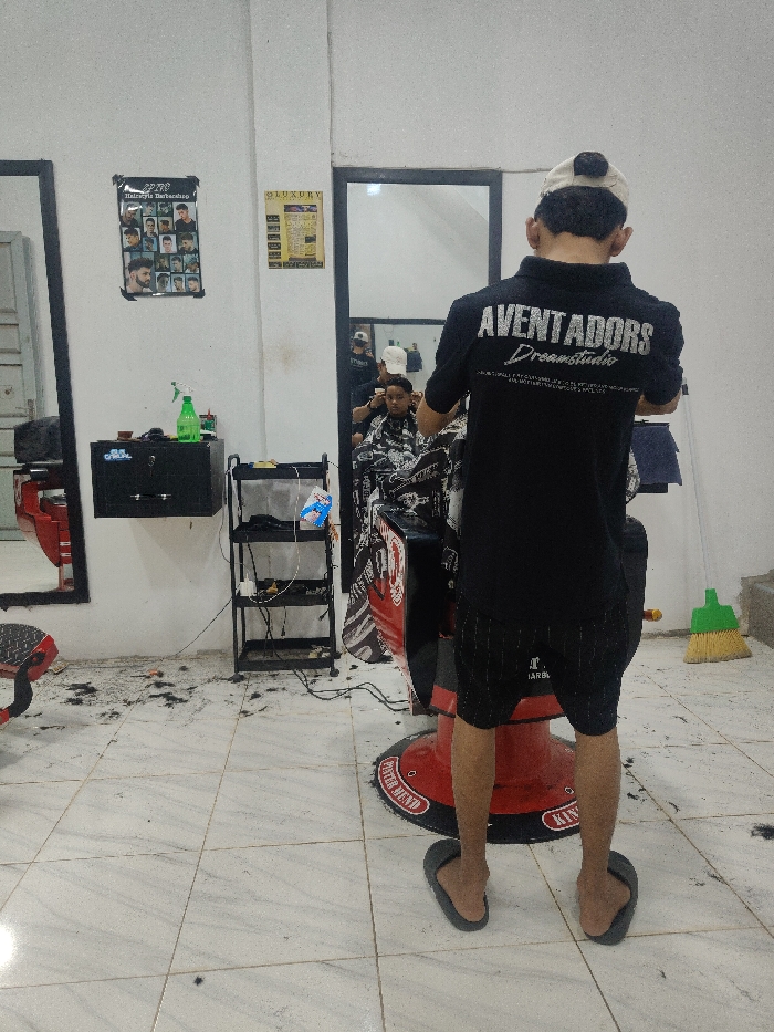 An indoor barbershop in Gampongpaya, Indonesia, depicts a male barber attending to a male client. The barber, viewed from behind, wears a black polo shirt with "AVENTADORS DreamStudio" text, black shorts, grey flip-flops, and a light-colored baseball cap worn backward. He stands behind a client seated in a red and black hydraulic barber chair, who is draped with a patterned black and white barber cape. The client's face is visible in the reflection of a large mirror on the right wall. The white tiled floor is scattered with numerous dark hair clippings. To the left, a wall-mounted black cabinet holds a green spray bottle and other items. A black four-tiered rolling cart, containing various accessories and wires, stands adjacent to the cabinet. Two posters, one featuring "Hairstyle Barbershop" styles and another a "LUXURY" price list, are affixed to the white wall. A green dustpan and broom are visible on the far right.