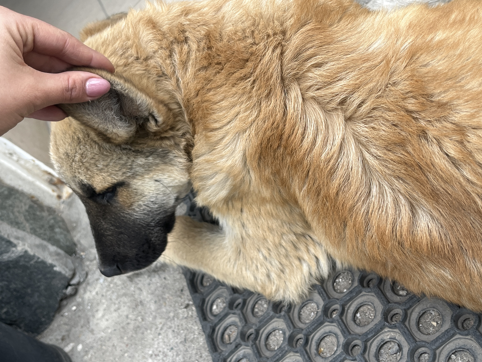 A person's hand is petting a light brown dog with a black muzzle and floppy ears. The dog is lying down on a gray doormat with circular patterned indentations. The scene appears to be outdoors, possibly in a public area given the presence of the doormat and concrete. The location is Dupnitsa, Bulgaria.