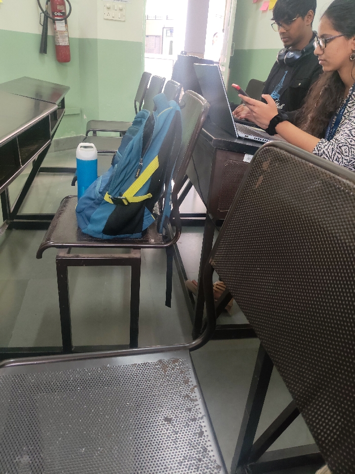 An indoor classroom scene shows chairs arranged in rows. A blue backpack and a water bottle are on a chair. Two people are seated at a desk with a laptop. One person is wearing glasses and a black jacket with headphones around their neck, while the other wears glasses and a patterned shirt. A fire extinguisher hangs on the wall. The foreground features a chair with a perforated seat.