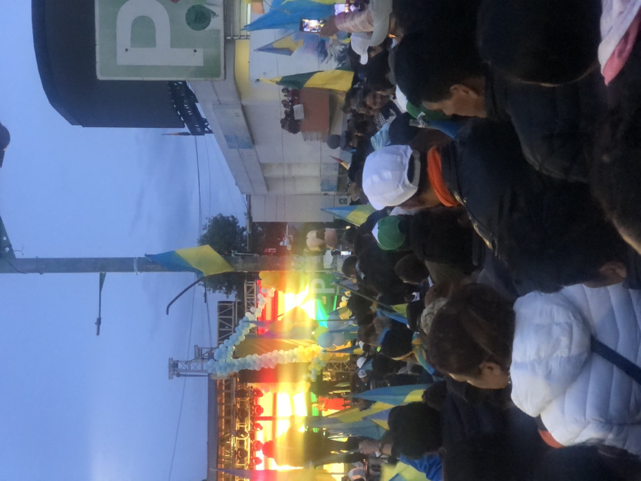 A crowd gathers, many holding Ukrainian flags. A stage is visible, adorned with lights and balloons. People are dressed in a variety of jackets and hats. A parking sign is seen atop a building. The overall scene appears to be a public gathering or celebration. The sky is visible in the background, suggesting an outdoor setting.