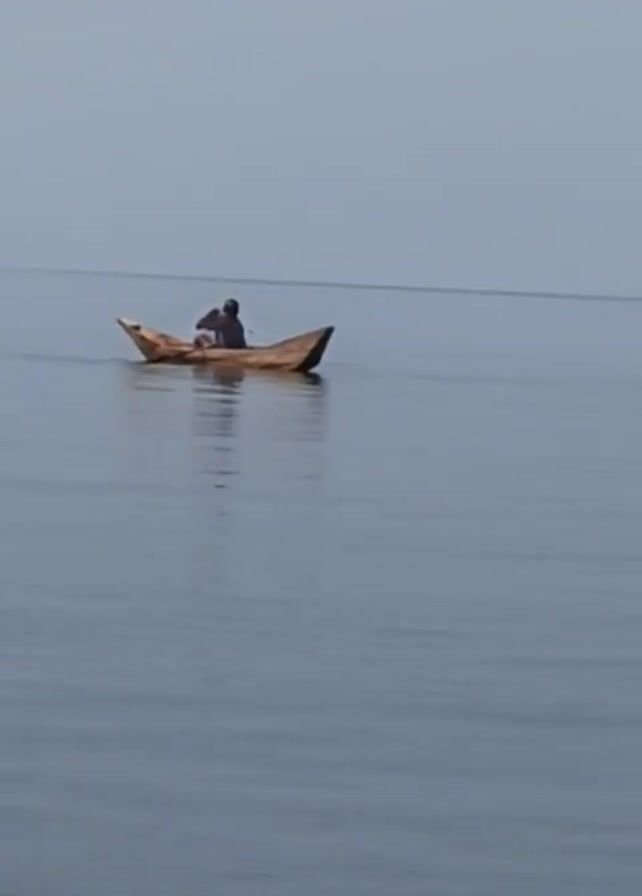 person in a small wooden boat on calm, gray-blue water under a muted, overcast sky. The boat is simple, likely hand-carved, with pointed ends, and the individual is seated in the middle. The person is facing away from the camera, gently propelling the boat forward with an oar. The horizon is a faint line in the distance, blending with the sky.