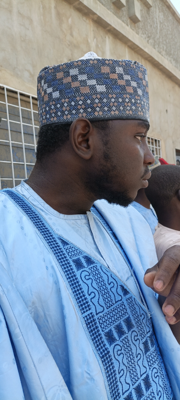 A dark-skinned adult male is depicted in a profile, close-up shot, facing right, situated in Kaura Goje, Nigeria