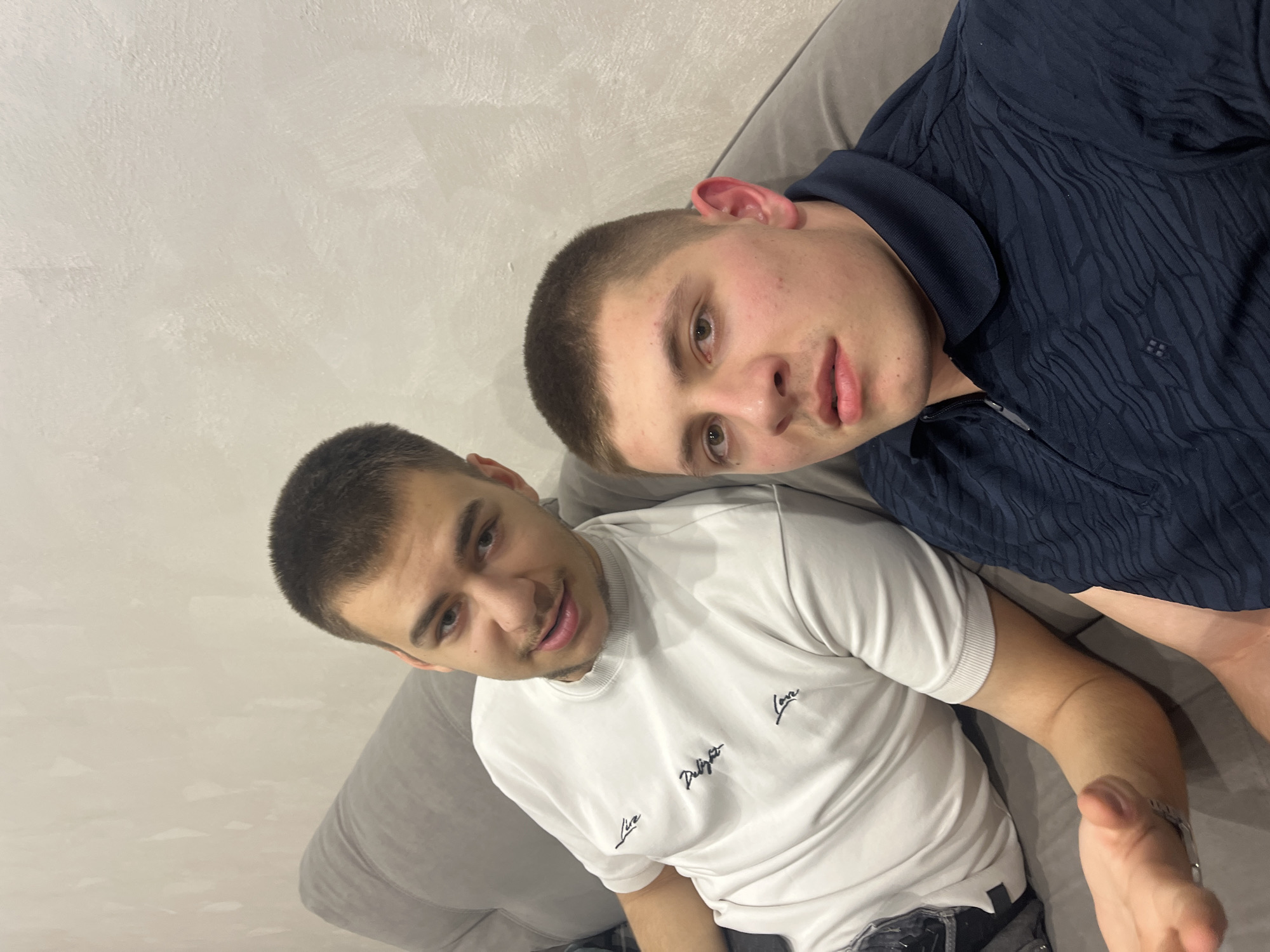Two young men are sitting on a gray couch. The man on the left is wearing a white t-shirt and the man on the right is wearing a navy blue polo shirt. The background is a plain, light-colored wall. There are no indications of the city of Sofia, Bulgaria in this image.