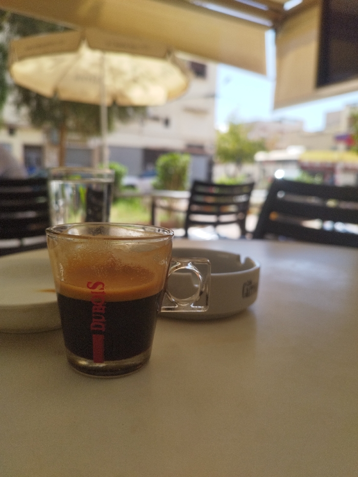 The image depicts an outdoor cafe scene in Meknes, Morocco, under a bright sky. In the foreground, a clear glass cup containing a dark espresso with a distinct reddish-brown crema layer is centered on a light-colored table. The cup has "DUBOIS" printed vertically in red on its side. To the right of the espresso, a white ceramic ashtray with three cigarette rests is visible. A partially obscured white saucer or plate lies to the left. Behind these items, a glass of water stands. The midground shows blurred black, slatted outdoor cafe chairs and additional tables. A large, light-colored patio umbrella is prominent in the upper left, providing shade. The background features out-of-focus urban buildings, green foliage from trees or bushes, and a clear blue sky. No individuals are visible, and no actions or interactions are occurring.