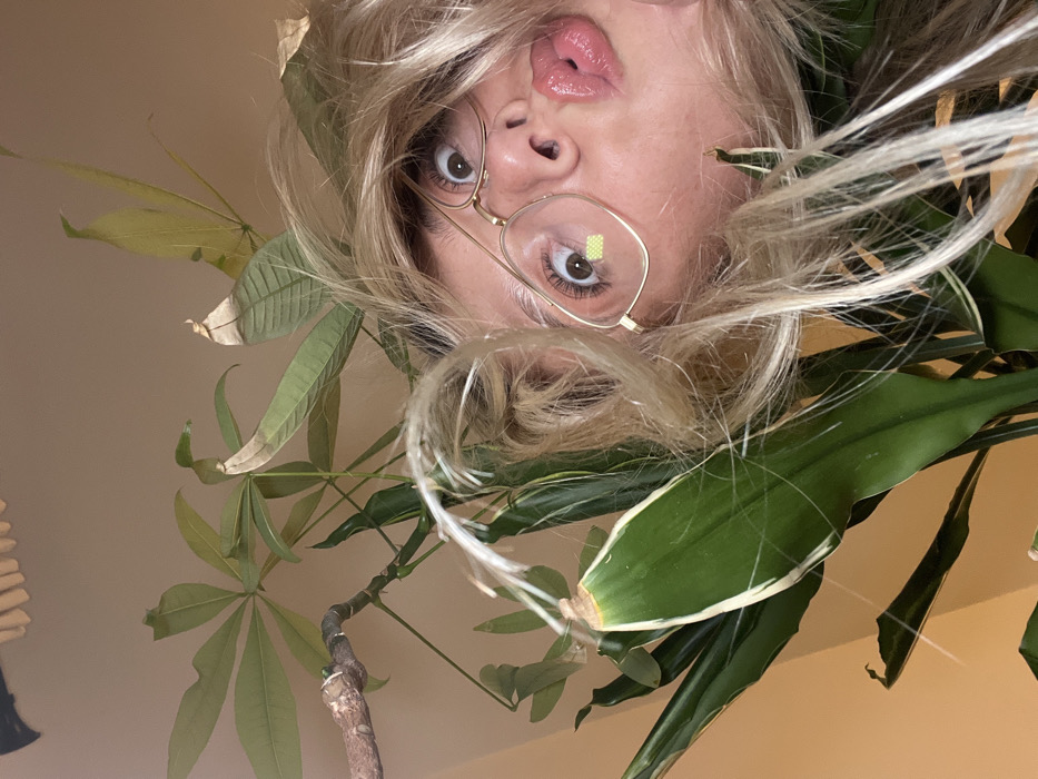 A close-up, inverted portrait features an individual with blonde hair, fair skin, and gold-rimmed octagonal glasses. The subject's wide-open eyes, with dilated pupils, directly face the viewer. Their mouth is puckered with glossy pink lips, and a small, bright green square is visible on the left spectacle lens. Dense green foliage surrounds the subject's head, including a plant with palmate leaves, some exhibiting browning at the tips, and another plant with long, sword-shaped leaves featuring lighter, variegated edges. A gnarled brown branch is partially visible behind the upper left foliage. The background is a plain, light orange-tan wall, with a partial view of a wooden decorative element at the top. This indoor scene is located in Witham, United Kingdom.