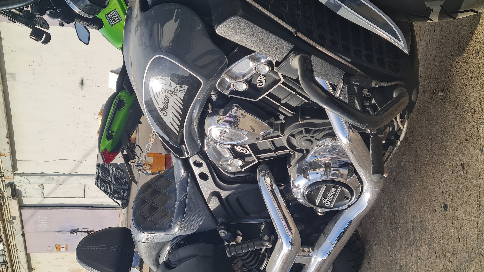 The image captures a static outdoor scene in Rishon LeZion, Israel, featuring two motorcycles parked on a concrete surface against a building wall. The primary subject is a dark grey Indian motorcycle, positioned in the foreground and viewed from its right side. It features a black quilted leather seat with a backrest, chrome engine components bearing "1901" and "Indian" engravings, and prominent chrome exhaust pipes. The fuel tank displays an "Indian" logo with a Native American chief's head silhouette. A black crash bar is visible on the lower right side. Behind the Indian motorcycle, partially visible, is a bright green sport motorcycle, showing its rear section, a red taillight assembly, and a white sticker on its side inscribed with "FCK HZB." The background consists of a light-colored, textured building wall with signs of wear. A light pink door, marked with the number "307," is visible on the left side of the wall, with a warning sign affixed nearby. To the right of this door, a darker, recessed opening is present. A black plastic crate leans against the wall between the two motorcycles, and a yellow and orange barrier with a chain is situated near the rear of the Indian motorcycle. The scene is brightly lit by natural sunlight, causing reflections on the motorcycles' chrome surfaces. No individuals are present.