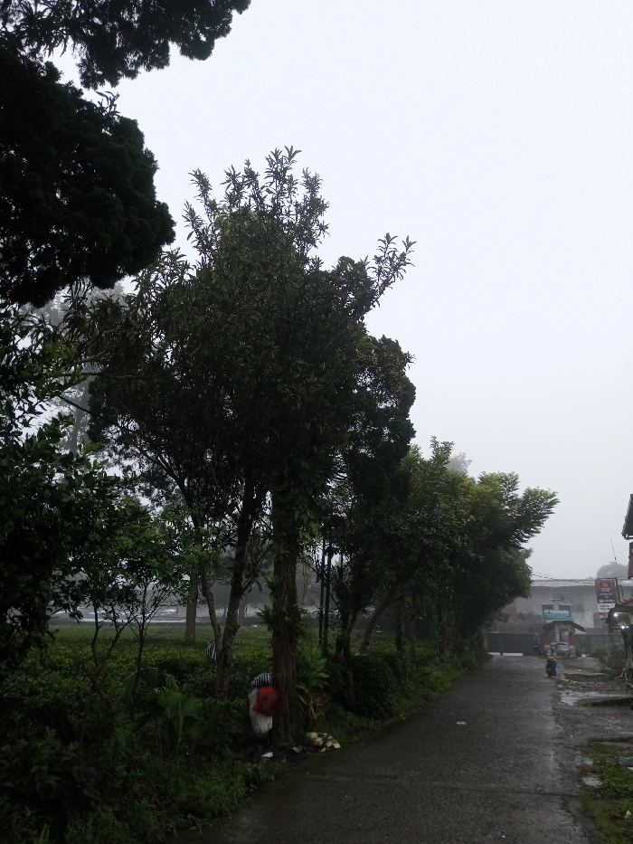 A misty landscape depicts a narrow, wet road flanked by dense vegetation