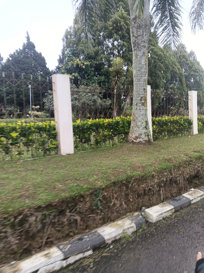 The image depicts an outdoor scene in Masaiti, Zambia, characterized by dense vegetation adjacent to a paved road. In the immediate foreground, a fragment of an asphalt road is visible. A damaged concrete curb, featuring alternating black and light-colored segments, runs along the edge of the road, parallel to the lower frame. Above the curb, an earthen embankment rises, topped by a manicured grassy slope. Further up the slope, a low, trimmed green hedge extends horizontally across the scene. Behind the hedge, a dark metal fence with a decorative criss-cross pattern is erected, supported by multiple tall, rectangular, light-colored concrete posts. One prominent, grey-barked palm tree trunk stands in the mid-ground, partially obscuring the fence and hedge. Behind the fence and hedge, a diverse collection of trees forms a lush background, including tall conifers and additional palm trees. A slender white pole is partially visible behind the fence on the left side. The sky appears overcast. A human finger is partially visible in the bottom right corner of the frame. No other individuals or specific actions are discernible.