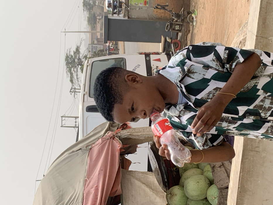 - "A male child, estimated 6-10 years of age, with dark skin, short curly black hair styled in a fade, is captured mid-action drinking from a partially deformed clear plastic bottle with a red cap and red-and-white label" by FM-zmDt63, licensed under CC BY 4.0
