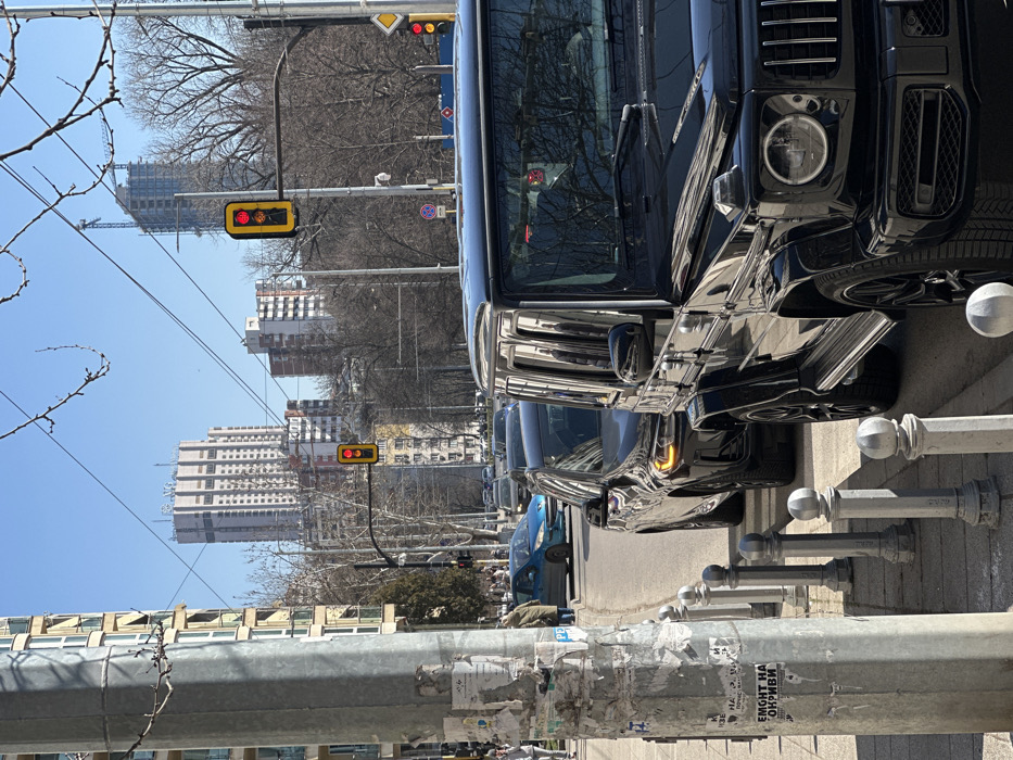 An urban street scene unfolds on James Bourchier Boulevard in Sofia, Bulgaria, under a clear blue sky on a sunny day. In the immediate foreground on the left, a weathered concrete utility pole, heavily covered with torn posters and stickers, stands beside a row of light grey, spherical-topped street bollards bordering a light-colored sidewalk. To the right of the sidewalk, a line of traffic is stopped, facing away from the viewer. The closest vehicle is a black Mercedes-Benz G-Wagen SUV, its front right quarter, circular headlight, and prominent grille clearly visible. Behind it, a dark-colored SUV, possibly a BMW, shows its front left headlight and part of the hood. Further down the multi-lane street, additional vehicles are visible, including a light blue Peugeot hatchback in a left lane. Overhead power lines crisscross the upper portion of the frame. On the left side of the street, several indistinct pedestrians are visible on a distant sidewalk, some wearing coats. Multiple traffic lights are present, prominently displaying red signals, consistent with the stopped traffic. Street signs, including a red circular "No Entry" sign, are also discernible. The background is dominated by several tall buildings. The most prominent structure is the Hotel Marinela Sofia, identified by "VITOSHA" signage atop its distinctive multi-story facade, located roughly center-left. Other high-rise residential and commercial buildings are scattered across the horizon. To the far right, a tall building under construction, complete with a visible crane, stands out. Numerous bare deciduous trees line the street and fill gaps between buildings, indicating late winter or early spring conditions.