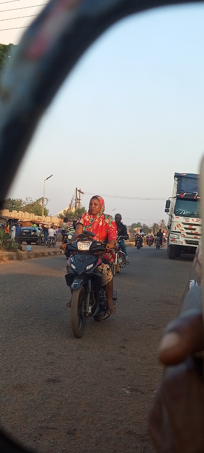 A woman wearing a red floral top and headscarf rides a black motorcycle on a paved road. Behind her, other motorcycles follow, along with a white truck. Various pedestrians stand on the sidewalk to the left. The sky is bright. A portion of a vehicle's frame is visible in the foreground on both sides of the image.