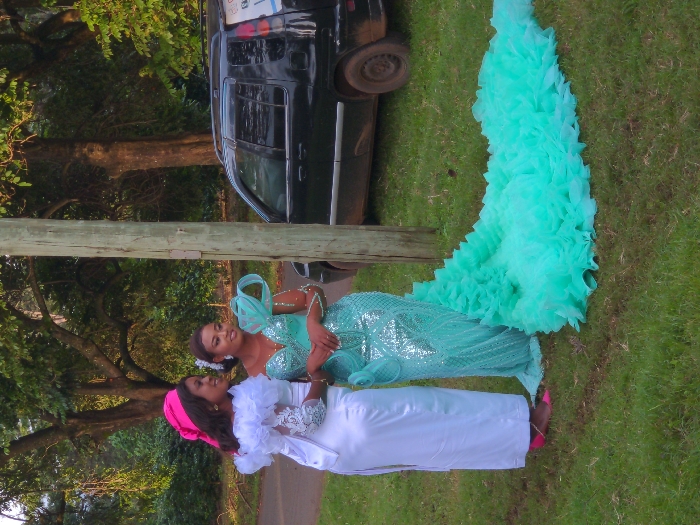 Two women are standing next to a wooden pole in a grassy area in New Hope, Tanzania, located at coordinates (latitude: -3.275, longitude: 37.317). The woman on the left is wearing a white dress with a white lace overlay, and a pink head wrap. The woman on the right is wearing a turquoise, sequined dress with a long train of fabric that is ruched. She has on light makeup, and her hair is styled in a bun. The woman on the left is looking down at the ground while the woman on the right is looking to the right, out of the frame. Behind them is a black car with a large, dark rear window. The scene appears to have been taken during the day, as the lighting is bright and the grass is green. There are trees and foliage in the background. A wooden pole, possibly a utility pole, is located between the two women, and seems to be leaning to the left. The pole is in the center of the image. The image appears to have been taken at a distance, capturing a wide shot of the women and their environment.