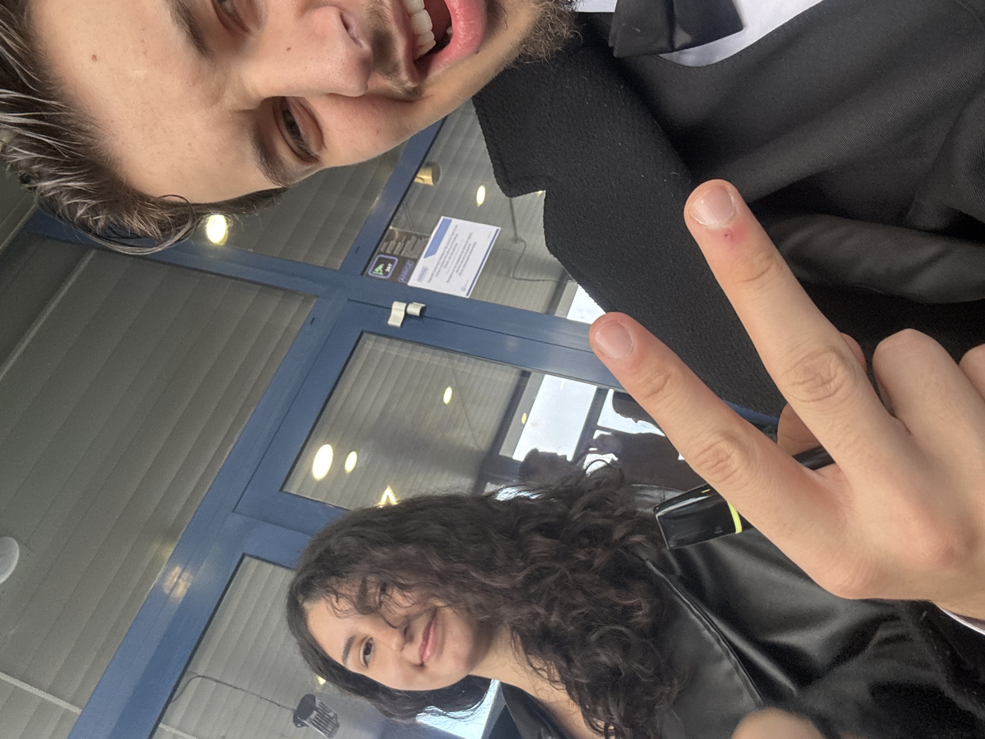 A selfie photograph features two individuals. The person at the top is male, and partially visible, showing the upper part of his face and torso, with wet hair and a dark suit and bow tie. He has facial hair and an open mouth, revealing his teeth. His hand displays a peace sign. The person at the bottom is female with curly dark hair, and she is smiling, only part of her torso and head is visible. Behind them are blue framed windows and ceiling lights. A sign is affixed to the window. The location is Sofia, Bulgaria.