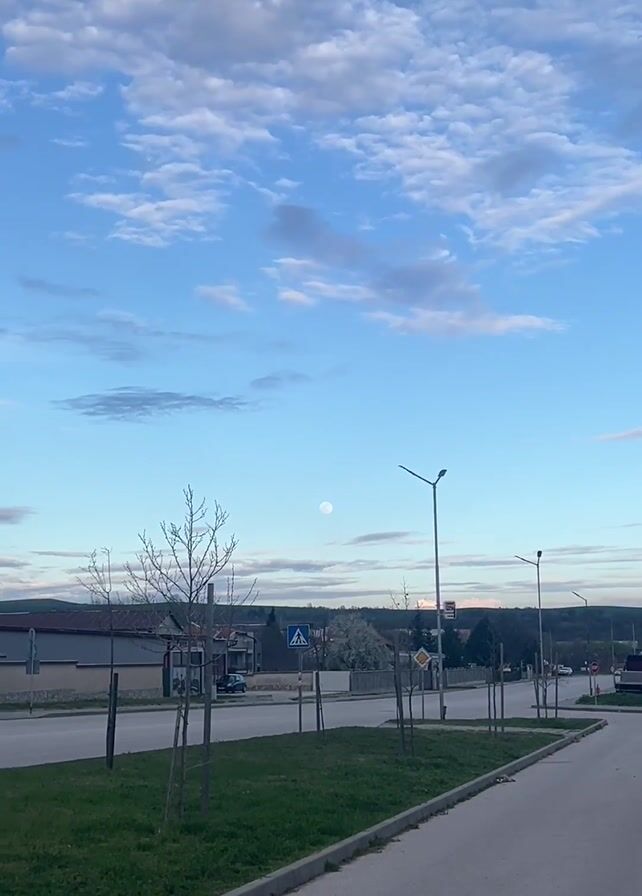 scene on a street with a sidewalk on the right. On the other side of the street, there is a grassy median with young trees. Further in the background are houses and fields. The sky is light blue with white, scattered clouds, and a full moon is visible in the sky. There are streetlights along the road. Cars are visible moving in the street. There is a pedestrian crossing sign.