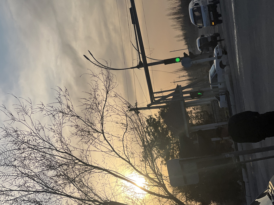 The image depicts an outdoor street scene in the city of Unknown, Unknown, captured during the golden hour, with the sun positioned low on the left horizon, casting strong backlighting