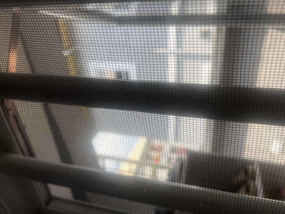 The image displays an exterior view from behind a dark, fine-mesh window screen, which is prominently in the foreground, forming a grid pattern across the entire frame