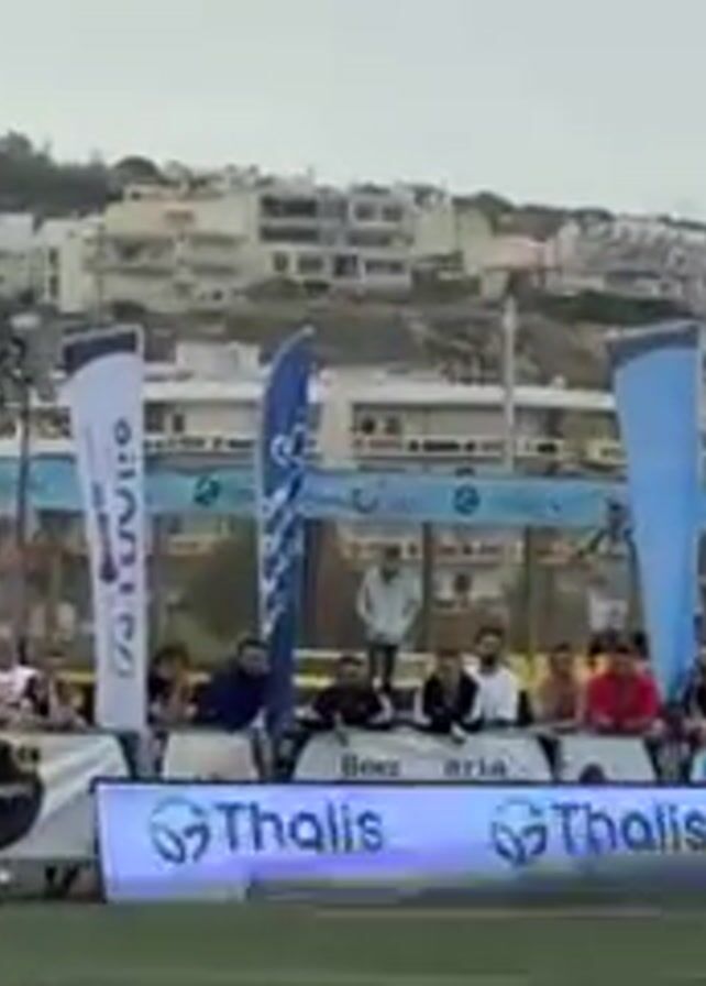soccer player in a pink uniform attempting to score a goal. He is facing a goalkeeper dressed in yellow. The player kicks the ball towards the goal, but the goalkeeper blocks it. There is a crowd of people watching behind a barrier that is decorated with sponsor banners. The soccer field is located on a grassy area. The background features buildings and hills. The sky is overcast.