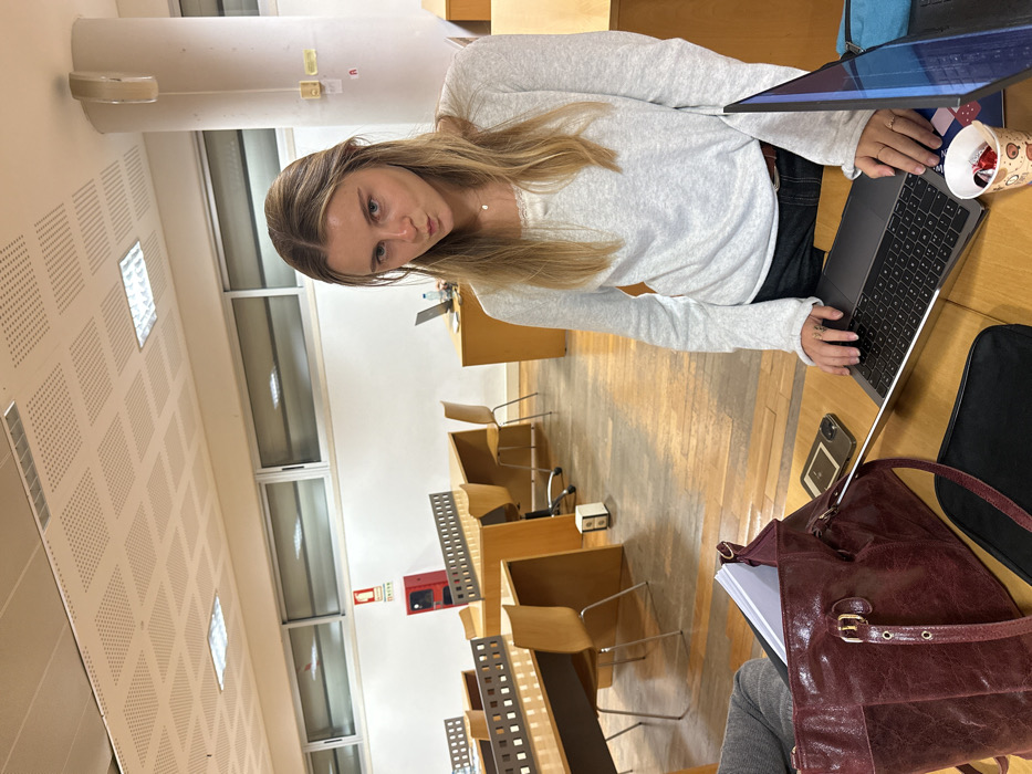 The image depicts an indoor scene within what appears to be a library or study hall, located in the city of Oeiras, Portugal. In the foreground, a young Caucasian woman with long, light brown hair parted in the middle is standing, facing forward, and looking directly towards the camera with pursed lips. She is wearing a light grey long-sleeved sweater with a white lace trim at the neckline, dark trousers, and a brown belt. Her hands are positioned over the keyboard of an open silver-colored laptop resting on a light brown wooden table. To the left of the woman's laptop, a large, dark red leather shoulder bag with a gold buckle is placed on the table, alongside a stack of white papers. A smartphone in a clear case is positioned face up between the bag and the laptop. A black soft case is partially visible beneath the red bag. To the right of the woman's laptop, a second open laptop is partially visible, with a blue-toned screen. Next to this second laptop is a patterned paper cup containing individually wrapped candies. The arm and shoulder of another individual, wearing a grey garment, are partially visible in the lower left corner, suggesting they are seated at the same table. The background shows an expansive room with light brown wooden parquet flooring and white walls. A row of multiple light brown wooden study desks, some with dark brown partitions creating individual carrels, are arranged in parallel rows. Several light brown wooden chairs with light-colored seats are placed around these desks. A red fire extinguisher cabinet is mounted on the far wall. A large, light-colored circular column is present on the right side of the image. The ceiling features white perforated acoustic panels with rectangular fluorescent light fixtures. A row of horizontal windows is visible high on the back wall. A small white electrical outlet box is on the floor in the mid-ground.