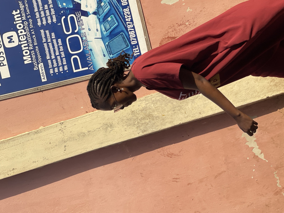 An individual is depicted walking right-to-left in front of a building in Samaru, Nigeria, specifically Opposite Block A1 Shop 5, as indicated by a prominent sign. The subject is a female with dark complexion, wearing pink-framed eyeglasses and small white stud earrings. Her hair is styled in dark braids, gathered at the back. She wears a loose-fitting, short-sleeved maroon garment with visible white text on the chest. The background consists of a textured, light reddish-pink painted wall on the left, exhibiting signs of wear and peeling paint. A vertical, light beige architectural element separates this wall from a large rectangular blue sign on the right. This sign, titled "Moniepoint Business Relationship Manager," advertises various POS (Point of Sale) services, including terminal issuance, account opening, ATM services, and data sales. It displays images of several handheld POS devices and includes contact telephone numbers. Strong diagonal shadows on the reddish-pink wall indicate direct sunlight from the upper left.