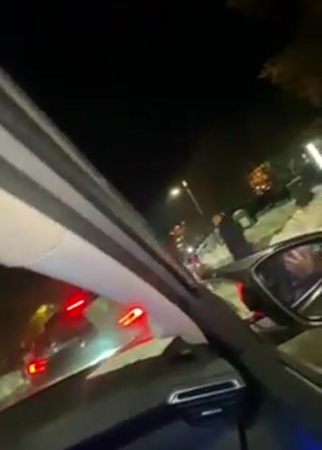 car stopped in traffic at night. The car's interior has blue LED lights. Pedestrians are crossing the street in front of the car. There is snow on the side of the road. The car starts moving again.
