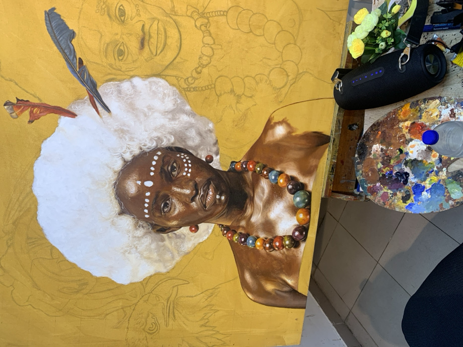 An overhead view captures an ongoing oil painting situated on a wooden easel within an artist's studio in Ado, Nigeria. The central subject of the painting is a dark-skinned woman with a stern expression, facing forward. She is depicted with voluminous white afro-textured hair, circular red earrings, and a large multicolor beaded necklace featuring various hues. White dot patterns adorn her forehead, temples, and chin. The background of the canvas is a plain yellow. Faint pencil sketches on the yellow background indicate uncompleted elements: an eagle's head to the upper left and the outline of a second individual, also adorned with a necklace, to the right. Two distinct feathers, one reddish-brown and one dark blue, are rendered in the upper right quadrant of the canvas. In the immediate foreground, positioned on a surface below the easel, are various artist's tools and personal items. These include a well-used artist's palette displaying multiple dried and wet paint colors, a clear plastic water bottle with a blue cap, a black cylindrical portable speaker with blue illuminated indicators, and a small artificial floral arrangement containing yellow and green flowers. A glimpse of a dark, possibly upholstered, stool or chair is visible on the far left. The floor is tiled with light-colored square tiles, and a plain light-colored wall is visible in the background, reinforcing an indoor studio environment.