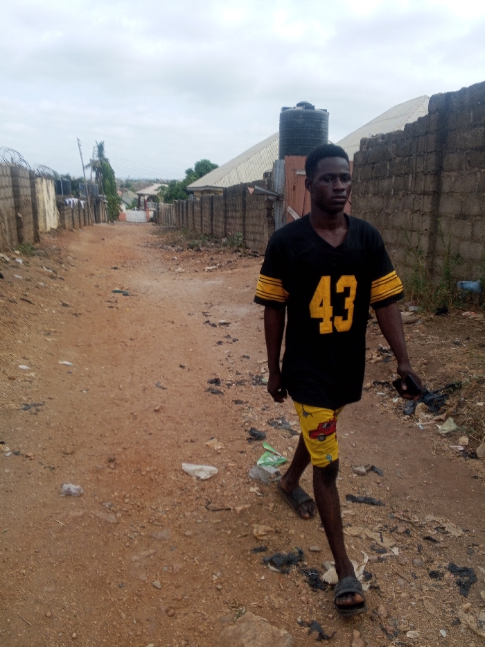 A young man in a black and gold "43" jersey and yellow shorts walks along a dirt path. The path is littered with trash and debris, flanked by concrete block walls and buildings. A black water tank is visible behind the man, adding to the rundown atmosphere. The sky is overcast, giving the scene a muted and somber tone. The man is holding something dark in his right hand.