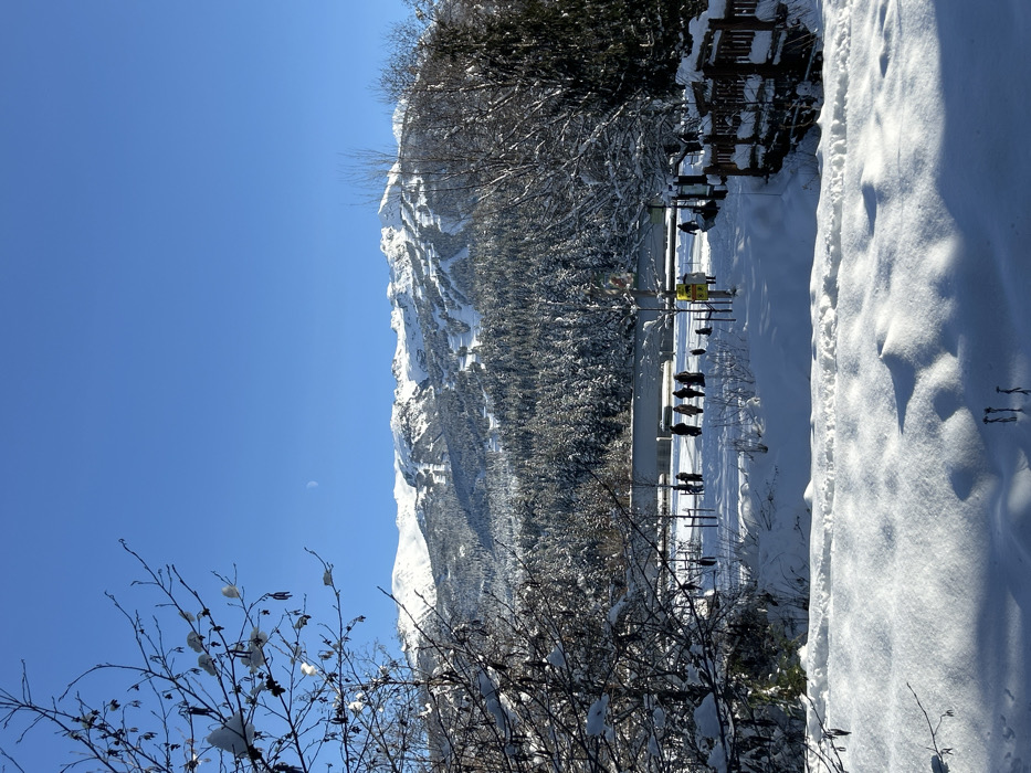 Snow-covered mountain landscape under a clear blue sky. A forest of snow-dusted trees descends from the mountain's base. A thin, light-colored line intersects the view, possibly a lake or snow-covered field. A wooden structure sits at the edge, and a few individuals are visible in the distance. Foreground branches with snow accents add depth.