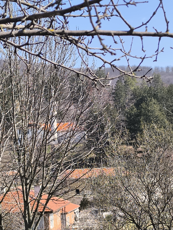 An outdoor, elevated view in the city of Byala Palanka, Bulgaria, depicts a residential area nestled within a hilly, partially forested landscape under a clear blue sky. The foreground is dominated by a dense network of bare, dark-brown tree branches, some appearing thicker and closer to the viewer, framing the scene. In the mid-ground, several structures with orange and red tiled roofs are visible amidst numerous bare deciduous trees. One prominent building on the left features white walls and an orange-tiled roof. Another smaller building in the lower-left has brick walls and a similar tiled roof. Scattered throughout the mid-ground are other residential rooftops, partially obscured by the sparse branches of the deciduous trees, some of which exhibit faint yellowish-green buds. The background consists of a densely forested hill or mountain range, primarily covered with dark green evergreen trees, indicating an early spring or late winter season. No individuals or discernible activities are present.