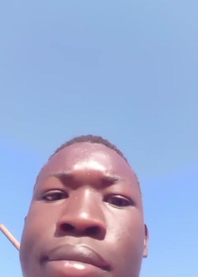 person of dark complexion walking outdoors on a bright sunny day. The sky is blue. The individual is wearing a red and white shirt and is visibly perspiring. Initially, the camera focuses closely on the person's face. The person seems to be speaking, though the audio is unclear. The camera angle changes to show a dirt road lined with walls and telephone poles. The person continues to walk, occasionally looking up at the sky.