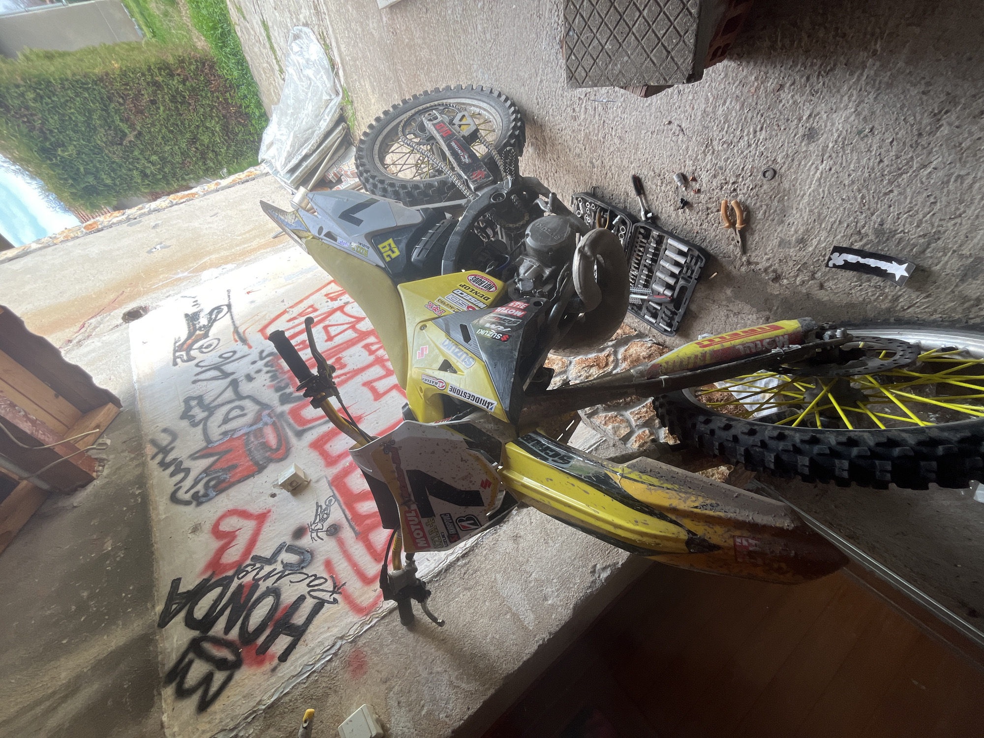 yellow and gray Suzuki dirt bike in a state of disrepair, located on a concrete surface with graffiti. The graffiti includes the word "HONDA" along with other illegible markings. The bike has several stickers indicating brands such as Bridgestone, Maxima, Suzuki, and Motul. Tools, including a socket set and pliers, are scattered near the bike, suggesting recent or ongoing maintenance. The bike's wheels are visibly worn, indicating usage. The location is likely an outdoor or semi-enclosed space. The specific location in Koinare, Bulgaria cannot be determined from the image.