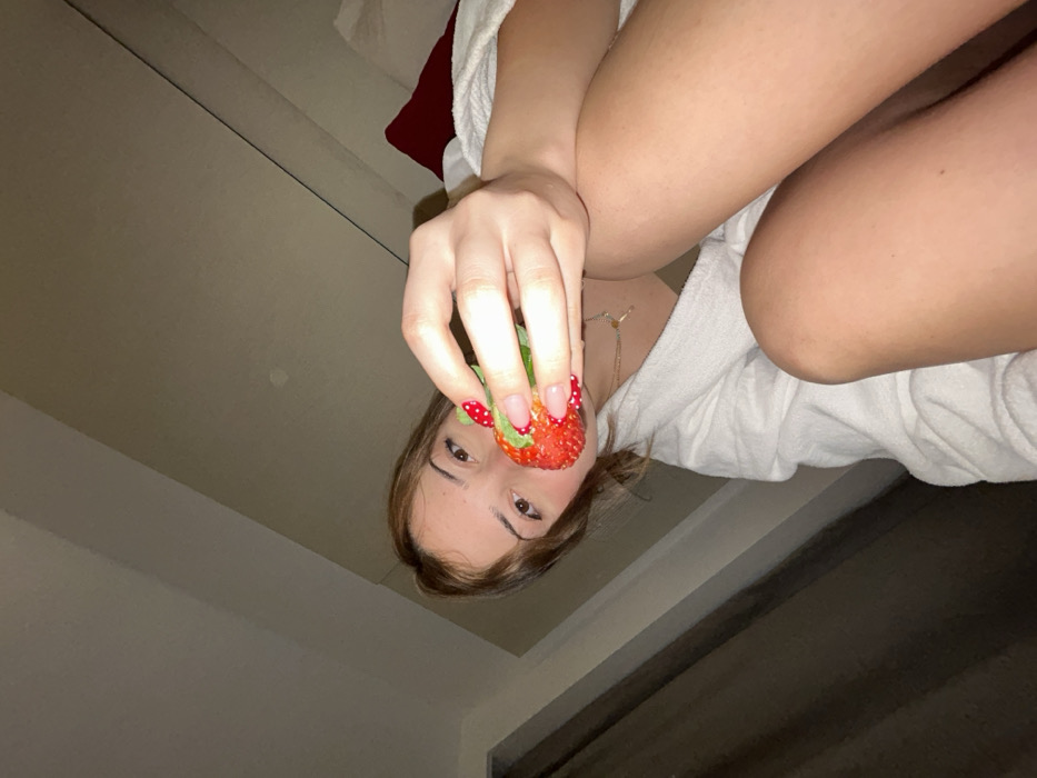 - "A woman holds a strawberry near her face, the red fruit contrasting with her white robe and nails adorned with red polka dots" by FM-OYOfL2, licensed under CC BY 4.0