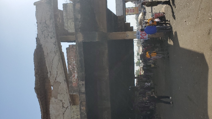 The image depicts an urban outdoor scene in Jos, Nigeria, characterized by a damaged concrete elevated structure under a clear blue sky