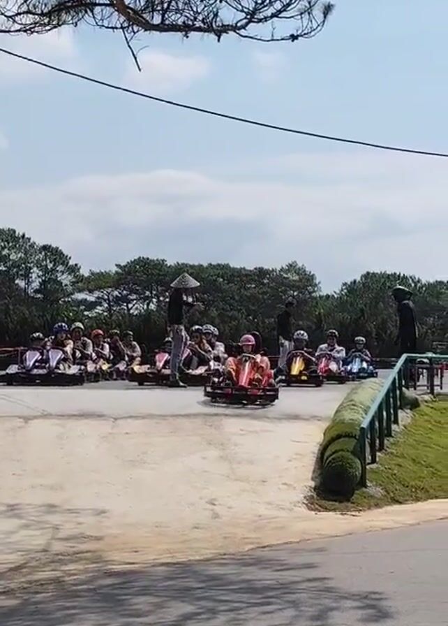 group of people getting ready to ride go-karts on an outdoor track. The track appears to be made of concrete. There are about 15 go-karts lined up on the track, facing the camera. Most of the drivers are wearing helmets. Several people who appear to be track staff are seen near the karts, one of whom is wearing a traditional Asian conical hat. The background consists of trees and a blue sky with some clouds. A green guardrail with rounded bushes is visible on the right side of the frame. A pine tree branch hangs in the upper left corner of the frame. One of the karts starts driving.